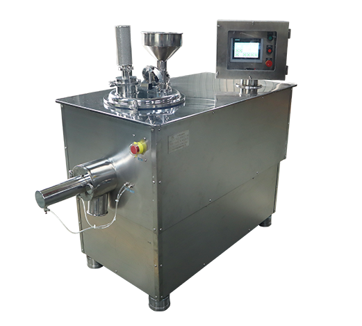 本機用于制藥工業(yè)中的固體制劑生產,集傳統(tǒng)制粒工藝中的混合和制粒兩道工序與一體同時進行,其制粒過程是先把粉料投入料筒內經攪拌漿形成翻滾狀態(tài),使不同性質的粉料得到徹底的混合,然后逐量加入粘合劑。(通過攪拌漿和筒壁對物料的擠壓、揉合,使其形成潮濕均勻的軟材,同時經制粒刀片的高速切割,逐步形成大小均勻的顆粒,最后由出料口排出,顆粒目數的大小由制粒刀的轉速和制粒時間控制)。